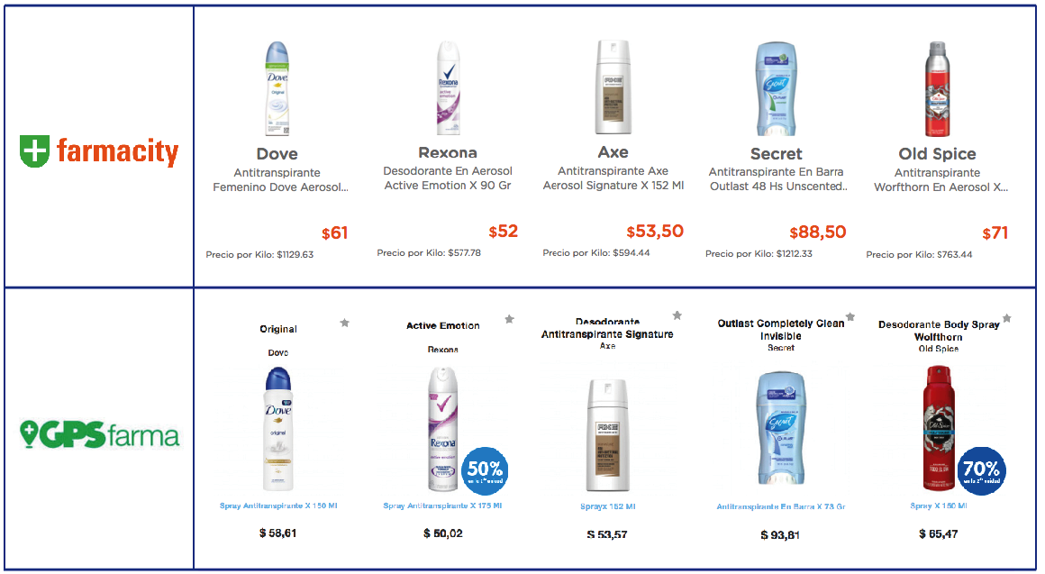 Unilever compite en el mercado con las marcas Dove; Rexona; Impulse; Axe; y Patrichs. Mientras que P&G da pelea con Secret; y Old Spice; y Beiersdorf con Nivea. Son casi todas multinacionales las que copan la categoría en el país.