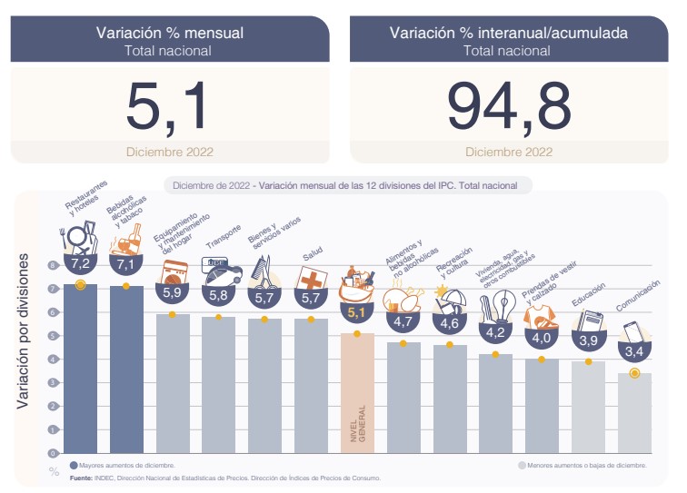 La inflación de todo el 2022 tocó el 94,8% en la Argentina. Se trata del guarismo más alto de toda América Latina. Según el último informe publicado por el INDEC, los precios minoristas treparon un 5,1% en diciembre.