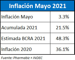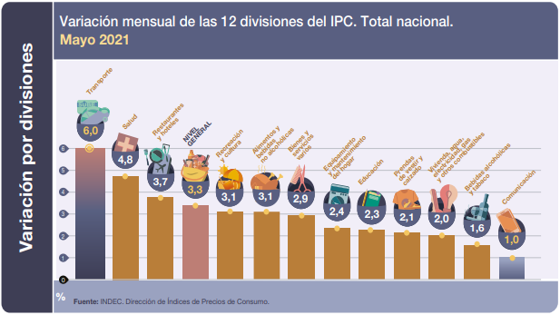 El INDEC publicó el IPC de mayo del 2021, que fue del 3.3%. Desde octubre del 2020 se registran mensualmente variaciones de más del 3%. Así, el acumulado en lo que va del año ya se disparó al 21.5%.