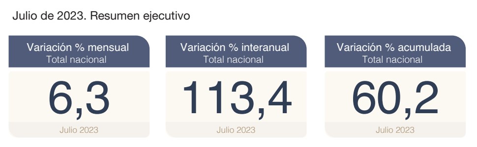 La inflación no encuentra freno en este 2023. Según el INDEC, en julio el IPC se disparó al 6,3% y la suba interanual llegó al 113,4%. Por su parte, en los primeros siete meses del año el incremento fue del 60,2%. Ver informe.