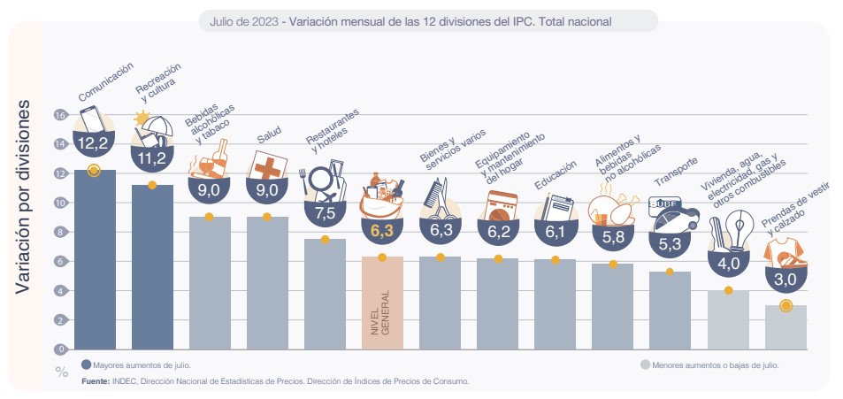 Según el relevamiento de los 12 rubros monitoreados por el INDEC, en julio el que más aumentó fue el de Comunicación, con 12,2%. Le siguieron los segmentos de Recreación y Cultura, con el 11,2% y el de Bebidas Alcohólicas y Tabaco, con un 9,0%. Asimismo, el rubro de Salud osciló un 9% en el séptimo mes del año.