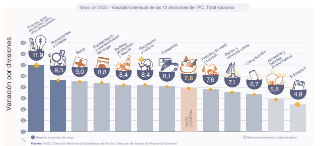 Según el relevamiento de los 12 rubros monitoreados por el INDEC, en mayo el que más aumentó fue el de vivienda, agua, electricidad gas y otros combustibles, con 11.9%. Le siguieron los segmentos de restaurantes y hoteles; y salud, con alzas del 9.3% y el 9.0%, respectivamente.
