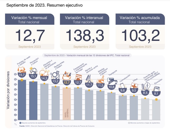 Según datos del INDEC, el IPC del noveno mes del año llegó al 12,7%. Así, la variación interanual se disparó al 138,3% y entre enero y septiembre el alza ya alcanzó el 103,2% en un escenario de controles de precios. Ver informe