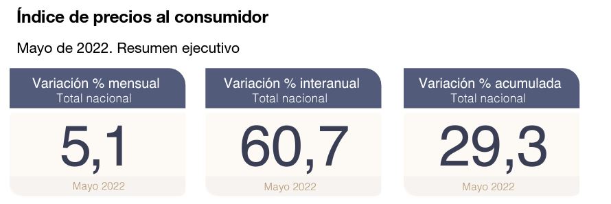 La inflación sigue sin dar tregua. El IPC de mayo que mide el INDEC se disparó un 5,1%, y el acumulado interanual ya superó el 60%, un nivel record para los últimos 30 años. En abril, la cifra había sido del 6%. Ver informe. Ver artículo Inflación abril.