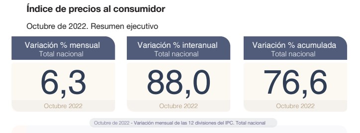 Con todo, la inflación de los primeros diez meses del año ya llegó al 76,6%, y la variación interanual marcó un 88,0%. A este ritmo, y a partir de estimaciones de las consultoras privadas encuestadas en el Relevamiento de Expectativas de Mercado, REM, elaborado por el Banco Central, en el 2022 la inflación podría alcanzar el 100%. Ver Inflación estimada.