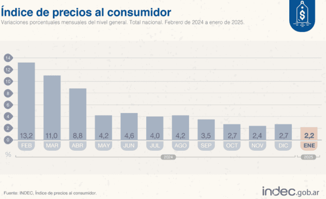 El 2025 comenzó con una inflación del 2,2% en enero, según el INDEC. Así, la suba de precios continúa en el sendero de la desaceleración, después del 2,7% de diciembre.
