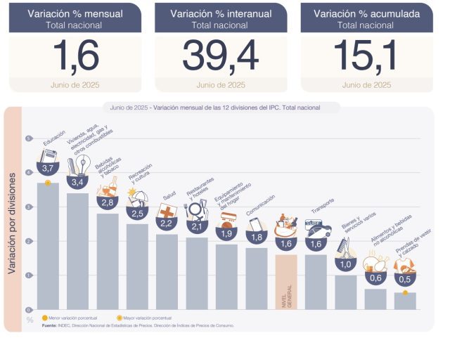 Por su parte, en mayo el IPC había marcado una variación del 1,5%. De esta manera, la suba acumulada en el primer semestre es del 15,1%, y el incremento interanual es del 39,4%. Ver IPC mayo