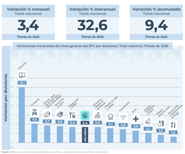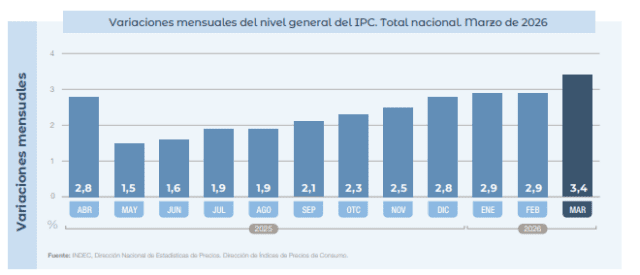 El Índice de Precios al Consumidor sigue sin dar muestras de desaceleración. En el tercer mes del 2026 la variación fue del 3,4%, según lo publicado por el INDEC hoy, martes 14 de abril. Ver informe