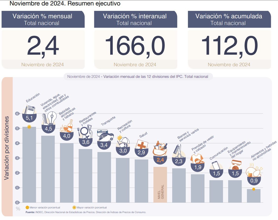 Hoy, miércoles 11 de diciembre, el INDEC dio a conocer el IPC de noviembre. Según el organismo, la inflación fue del 2,4% y se acumula una suba del 112% en lo que va del año.