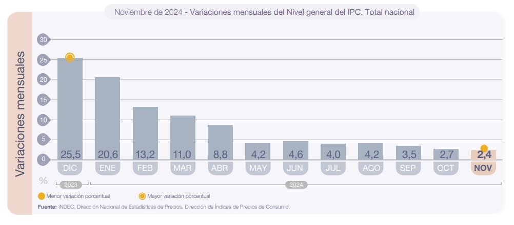 La suba de precios siguen en el centro de la escena, a pesar de que en el último trimestre se registró una desaceleración en el IPC. De acuerdo con el INDEC, en noviembre la inflación fue del 2,4%.