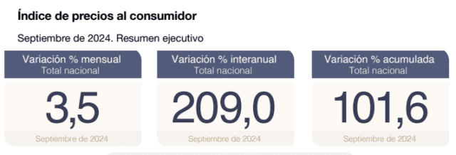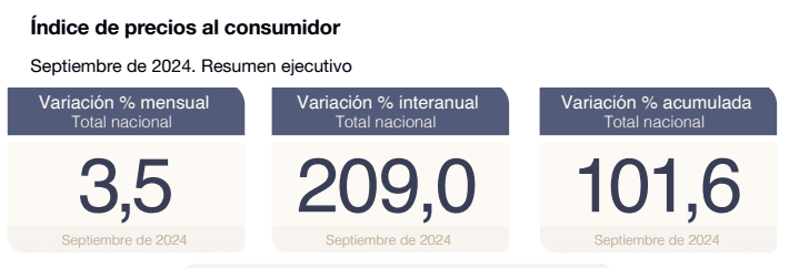 Según el instituto, en el noveno mes del año el IPC se incrementó un 3,5%. Por su parte, la suba interanual fue del 209% y el aumento acumulado alcanzó el 101,6%. Ver informe