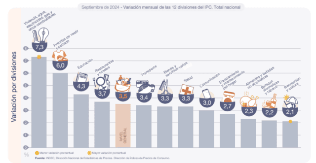 Los precios siguen siendo protagonistas en la economía local. Según el INDEC, en septiembre el IPC trepó 3,5% y la variación acumulada llegó al 101,6% en lo que va del año. Entre los rubros con más aumentos figura el de vivienda, agua, electricidad y gas, con el 7,3%.