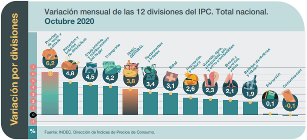 La inflación volvió a pisar el acelerador en octubre. Según el INDEC, el guarismo oficial llegó al 3.8% el mes pasado y se trata del número mensual más alto en lo que va del 2020. El BCRA estima que el año cerrará con un incremento del IPC del 35.8%.