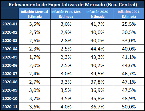 Después de seis meses seguidos de caída en la proyección inflacionaria anual, para el anteúltimo mes este índice pegó un salto de 0,9 puntos porcentuales desde el análisis precedente, en el cual se ubicaba en 35,8%. Para el 2021 ya se estima una inflación anual del 50%. Ver artículo.