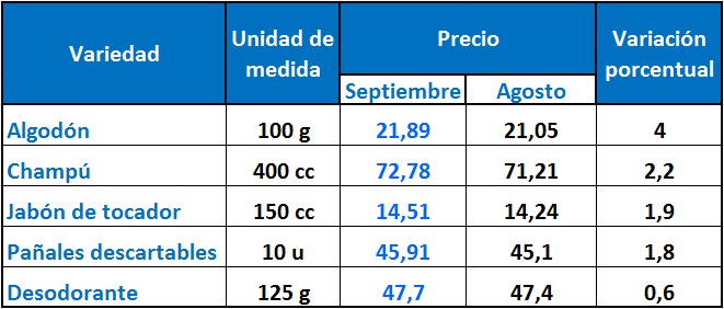Dentro de la canasta de productos de higiene y cuidado personal resaltó también el incremento consignado en la categoría de champúes. Durante septiembre el aumento oficial fue del 2.2%, mientras que la inflación de la canasta total fue del 1.9%.