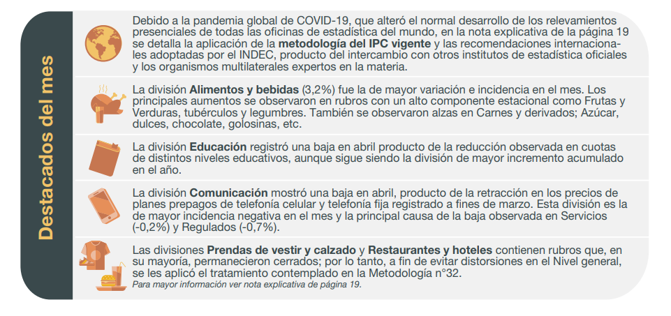 El cuarto mes del año tuvo las características de haberse desarrollado en completa cuarentena de la ciudadanía, que se vio limitada de realizar sus compras de forma regular y solo estaba habilitada para realizar transacciones en tiendas de alimentos y farmacias. Ver informe.