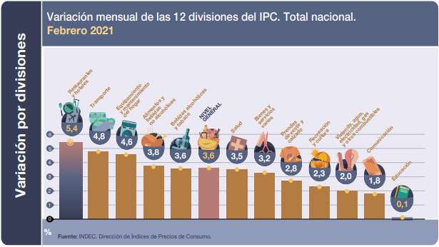 La inflación sigue en el ascensor en este 2021. En el segundo mes del año el Índice de Precios al Consumidor llegó al 3.6%. Esto se da en un contexto de congelamiento de algunos productos clave dentro de la canasta básica.