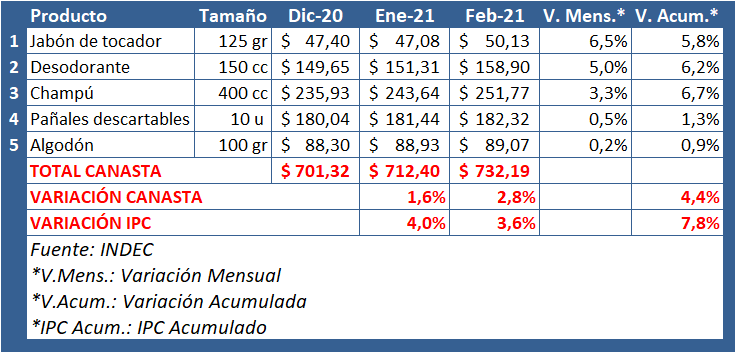 Durante febrero la canasta general se disparó un 3.6%, lo que de por sí se constituye en un indicador de relevancia. Sin embargo, algunos productos de higiene tales como el jabón de tocador y el desodorante se vendieron a precios muy por encima del promedio relevado.