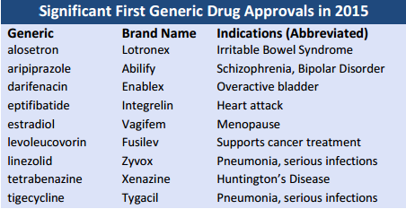Este número incluye 580 aprobaciones y 146 aprobaciones provisionales. Los medicamentos similares más significativos de acuerdo con la FDA fueron los genéricos de las marcas Lotronex, Abilify, Enablex, Integrelin, Vagifem, Fusilev, Zyvox, Xenazine, y Tygacil.