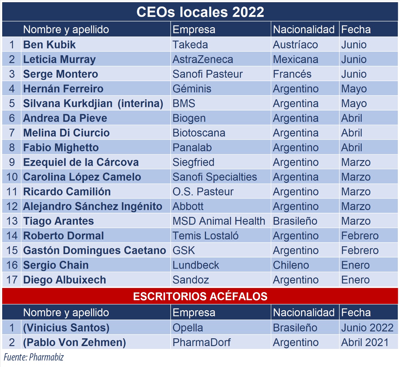 La británica AstraZeneca se mantuvo acéfala buena parte de este 2022, pero a fines de mayo dio a conocer a la elegida para tomar la posta de Agustín Lamas, quien salió de la multi en diciembre del año pasado. La mexicana Leticia Murray fue quien asumió en la compañía, después de que la regional Sylvia Varela fuera la responsable de forma temporal. Ver artículo Lamas | Ver artículo Murray.