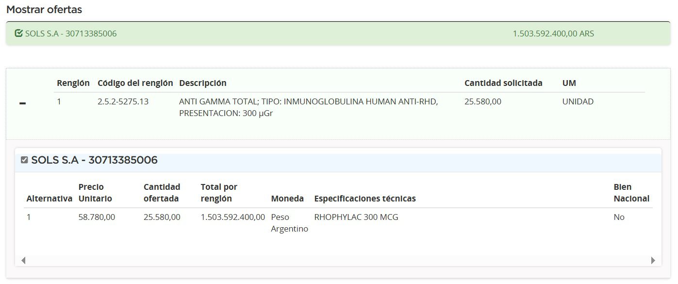La compañía cotizó un monto total de $1.503 millones (u$s 1.51 M) y a un precio unitario de $58.780 (u$s 59). Cabe aclarar que Sols se presentó a este proceso con Rhophylac, un producto de la australiana CSL Behring, y encabezada en la Argentina por Juan Pablo Guereño. Ver Cuadro Comparativo | Ver Pliego