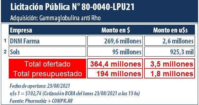 Según el desglose realizado por el equipo de analistas de Pharmabiz, la licitación está conformada por un solo renglón para el que se presentaron dos droguerías. La principal oferente fue DNM Farma, que participa en nombre del laboratorio nacional Biofactor. La firma cotizó con la inmunoglobulina humana ImmunoRho 300 por una suma de $269.6 millones (u$s 2,6 millones). La empresa fue la única que se postuló a fin de proveer al Estado del total solicitado de 30 mil unidades, con un precio unitario de $8.988 (us$ 87,46). Ver Cuadro Comparativo