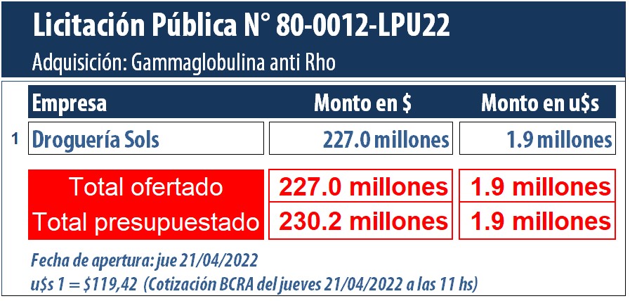 El proceso que tendrá alcance en las diferentes jurisdicciones del país cuenta con un presupuesto estimado de $230.2 millones (u$s 1.9 millones). El mismo fue solicitado por la Dirección de Salud Perinatal y Niñez y se detalla que tiene por objeto «garantizar el acceso al medicamento para la prevención de la Enfermedad Hemolítica Neonatal por incompatibilidad RH«.