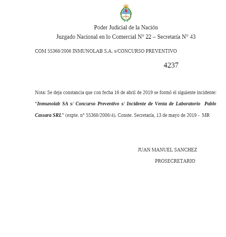Según el chequeo realizado por este medio, el Banco Central consigna que la firma tiene más de 50 cheques rechazados por falta de fondos, lo que representan un total de $2.036.679 (u$s 44.126). Y para sumarle aditamentos a esta historia, según el expediente 055368/08 de la Cámara Nacional de Apelaciones en lo Comercial, Inmunolab suma un incidente judicial bajo la firma del nacional Cassará, según fecha del pasado 16 de abril. Ver documento.