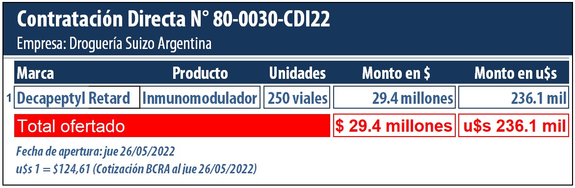 A fines del año pasado el Ministerio de Salud de la Nación emitió una Orden de Compra a fin de adquirirle a la droguería Suizo Argentina 180 viales del inmunomodulador Decapeptyl Retard, del laboratorio Raffo. Si bien dicha licitación aún no fue adjudicada de manera oficial, en este mayo la cartera sanitaria ya abrió una nueva contratación directa de similares características. Ver Contratación