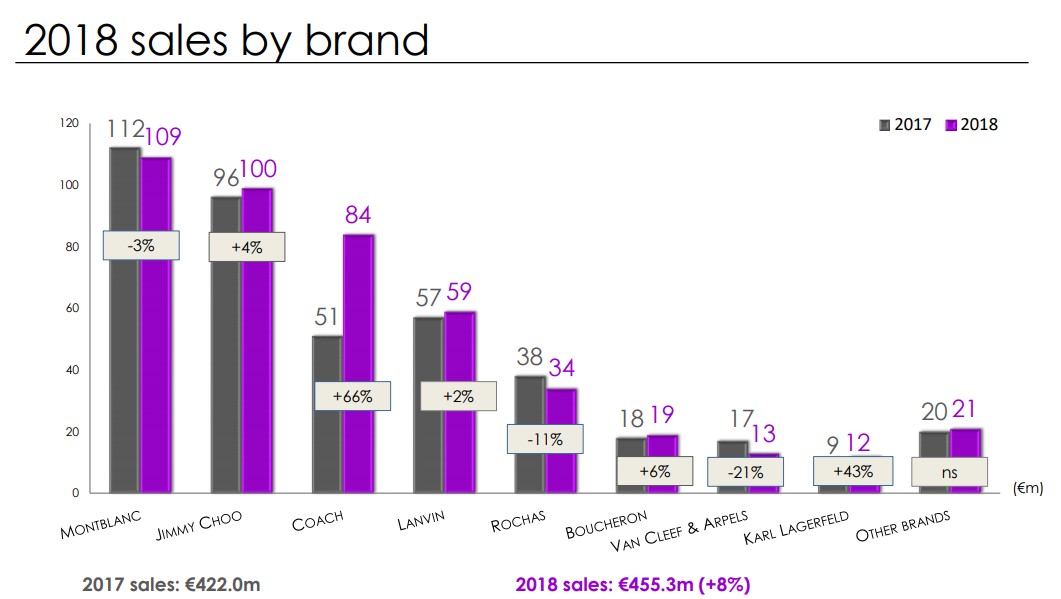 Otra fragancia que tuvo un buen comportamiento fue Karl Lagerfeld que creció un 43% en ingresos. Y más lejos estuvo Jimmy Choo que avanzó un 4%, aunque el volumen total de su facturación es largamente superior.