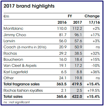 La marca que le otorgó mayores ingresos fue Montblanc que facturó € 112.2 millones, aunque frente al 2016 el incremento fue tan sólo del 2%. Por debajo se ubicaron las fragancias de Jimmy Choo que registraron ventas por € 96.1 millones y ascendieron un 17%, impulsadas principalmente por el lanzamiento de las líneas Jimmy Choo Man Ice y Jimmy Choo L’Eau, en 2017.