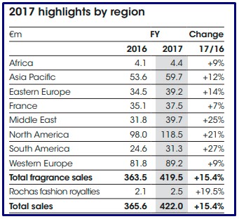 La multi de fragancias Interparfums publicó sus resultados en ventas para el año que concluyó. En el 2017 la firma alcanzó ingresos por € 422 millones, lo que significó un crecimiento del 16.3% en moneda constante, en comparación con el año anterior. Ver press release.