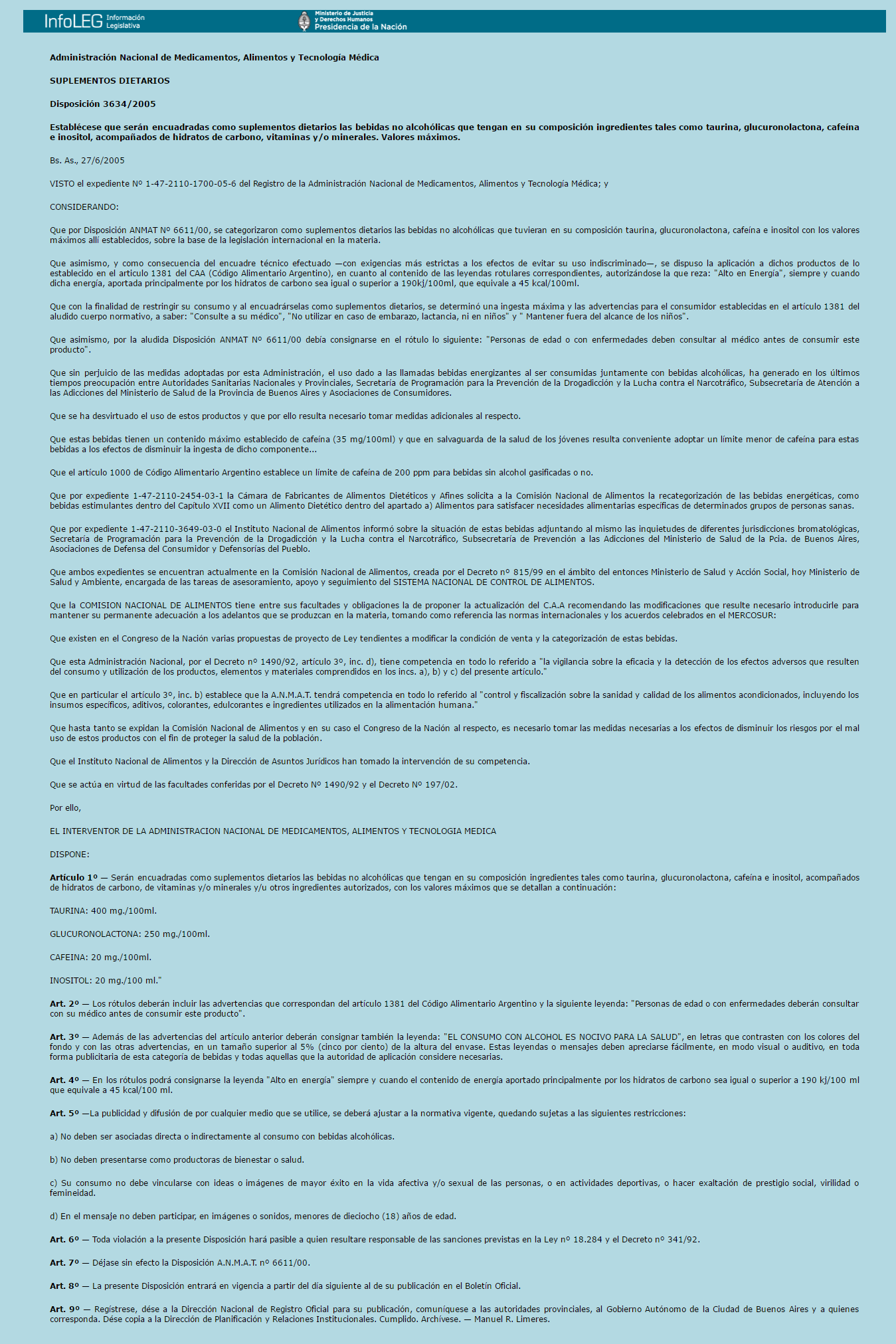 Fue por ello, que el organismo -en conjunto con la Comisión Nacional de Alimentos (CONAL)- estableció un capítulo aparte para las bebidas energizantes. A partir de la disposición nº 3634 emitida en el año 2005 estas bebidas sólo pueden contener 20mg. de cafeína por cada 100ml de su contenido. Ver diposición
