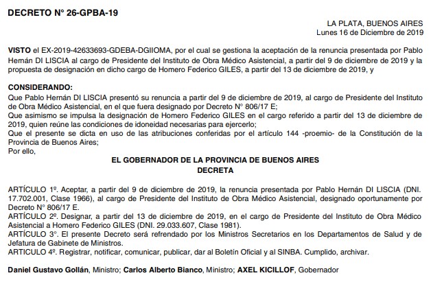 Es así, por caso, que en el Instituto de Obra Médico Asistencial –IOMA– ya asumió Homero Giles. El funcionario -que fue nombrado por el propio gobernador de la provincia de Buenos Aires, Axel Kicillof– se sentó en el sillón principal del edificio central de La Plata en reemplazo de Pablo Di Liscia, quien actuó durante la gestión de María Eugenia Vidal. Ver decreto