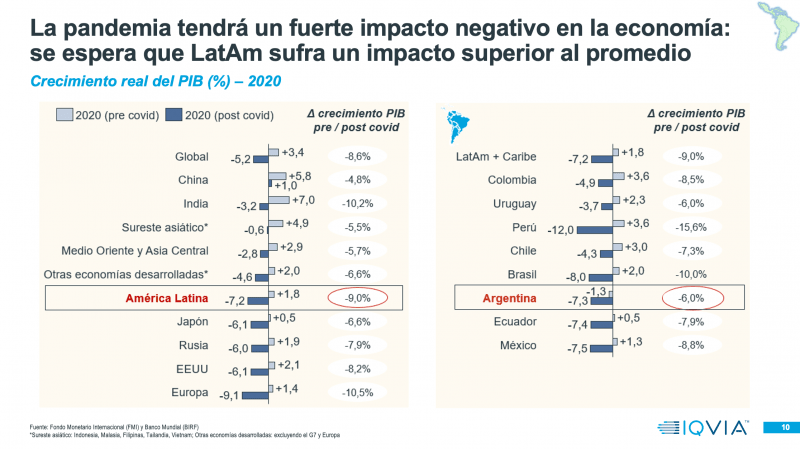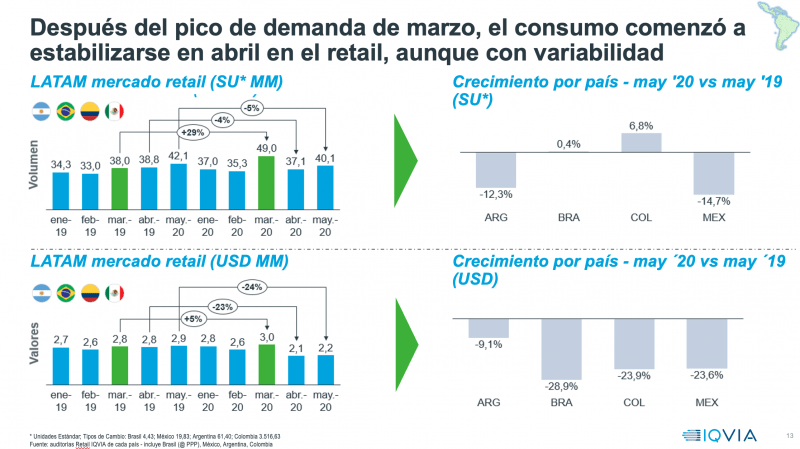 Por otro lado, el ejecutivo detalló que la crisis del coronavirus «cambió la normalidad respecto del consumo de medicamentos en Latam». En todos los países de Latinoamérica se registró un «abastecimiento preventivo» que hizo que en marzo el mercado mostrara un pico del 30% en volumen en comparación con el mismo mes del año anterior. Este comportamiento comenzó a estabilizarse en abril en el retail de toda la región, aunque con variabilidades en cada país. En general el consumo cayó un -4% en abril; y un -5% en mayo.