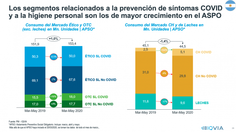 En esta etapa de Aislamiento Social Preventivo y Obligatorio, los segmentos relacionados con la prevención de síntomas del coronavirus y la higiene personal fueron los de mayor crecimiento. Al comparar marzo-mayo del 2020 con el mismo período del 2019, el mercado ético y de OTC -sin incluir las leches de fórmula- subió un 1% en total; mientras que el de Consumo Masivo y Leches cayó un -1.4%.