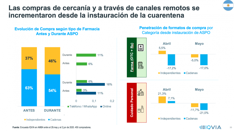 En esta etapa de cuarentena, del CEO local de IQVIA resaltó el cambio en el perfil de consumo. El mismo migró de los grandes centros urbanos hacia la periferia y así se incrementaron las compras en puntos de venta de cercanía. En simultáneo creció la demanda a través de canales remotos como páginas web y mediante pedidos por teléfono o WhatsApp.