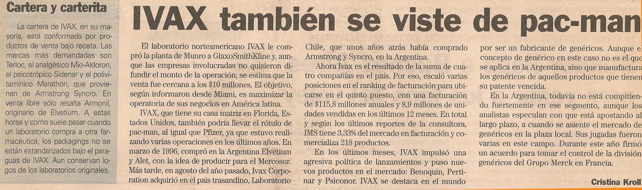 Ivax, que tiene su casa matriz en Florida, Estados Unidos, también podría llevar el rótulo de pac-man, al igual que Pfizer, ya que estuvo realizando varias operaciones en los últimos años. En marzo de 1996, compró en la Argentina Elvetium y Alet, con la idea de producir para el Mercosur. Más tarde, en agosto del año pasado, Ivax Corporation adquirió en el país trasandino, Laboratorio Chile, que unos años atrás había comprado Armstrong y Syncro en la Argentina.