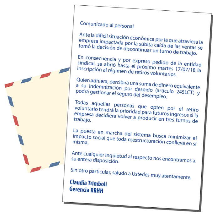 En una carta interna que lleva la firma de su gerente de Recursos Humanos Claudia Trimboli y a la que pudo acceder este medio, la compañía le atribuye su reestructuración a la «difícil situación económica por la que atraviesa Jayor, impactada por la súbita caída de las ventas«. Ver carta
