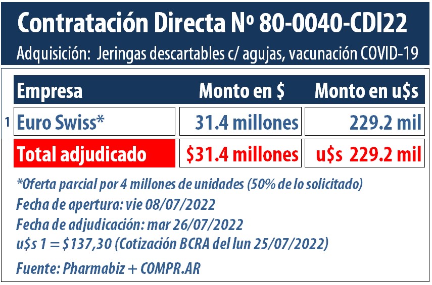 Según el desglose realizado por el equipo de analistas de Pharmabiz, de las cuatro compañías que se presentaron, solo una resultó adjudicataria. Si bien, la única que había ofertado a fin de cubrir el total solicitado -8 millones de unidades- fue la nacional Propato Hnos, la cotización de la empresa propiedad de la familia homónima fue desestimada por no ajustarse técnicamente a lo estipulado en el pliego.