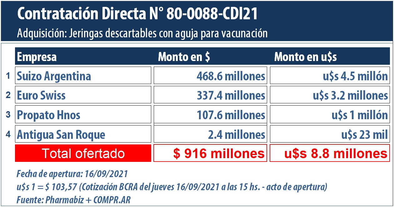 Luego del «agosto de las segundas dosis», este septiembre fue marcado como el mes en que llegaron las primeras vacunas anti COVID-19 de la norteamericana Pfizer a la Argentina. De cara al arribo de partidas de éste y de otros laboratorios, el Estado abrió una contratación directa a fin de adquirir 20 millones de jeringas descartables con agujas.