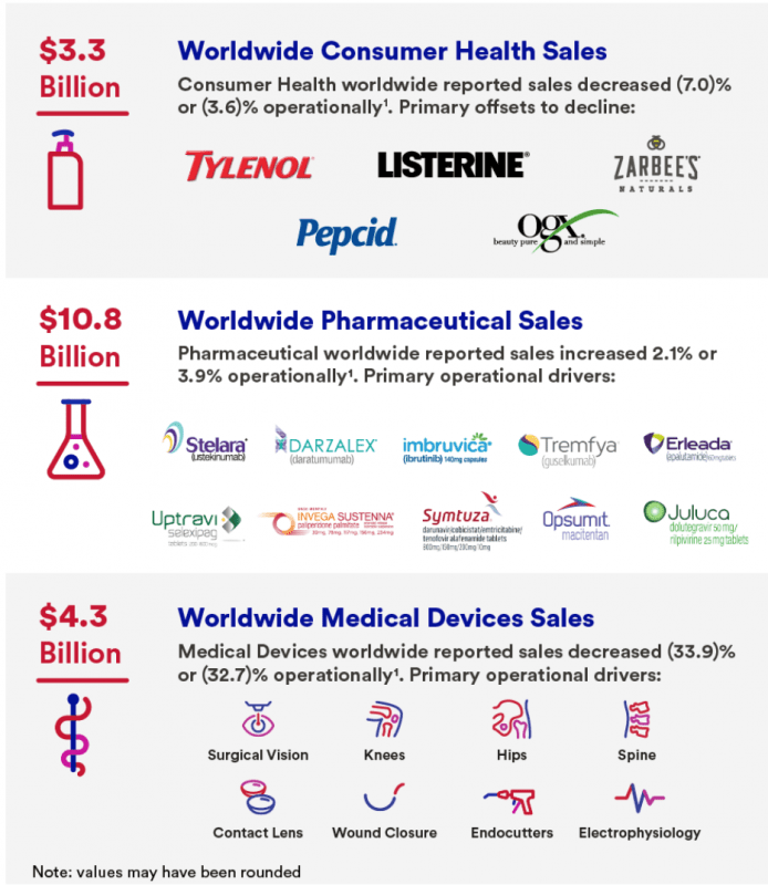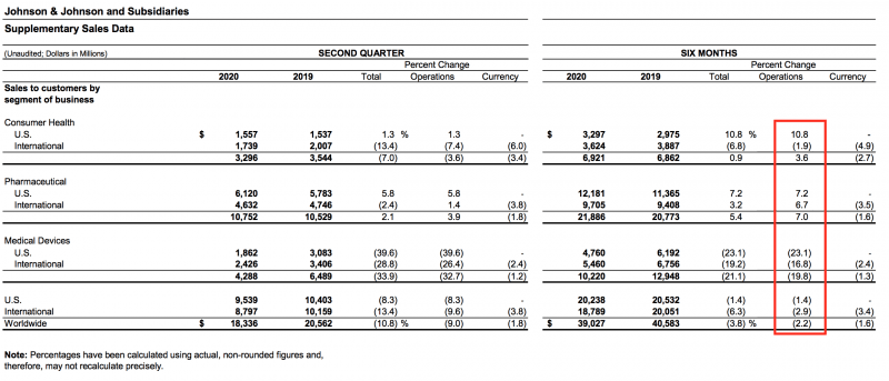 Las ventas globales de la estadounidense J&J durante el primer semestre de 2020 totalizaron u$s 39.027 millones, lo que representa una caída interanual operativa del 2,2%. La baja en los ingresos fue impulsada principalmente por el impacto negativo de la pandemia del COVID-19 en el segundo trimestre. Ver press release.