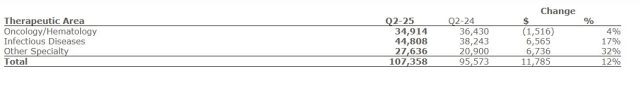 En el período abril-junio de este año, su negocio de Oncología/Hematología declinó un -4%, mientras que Enfermedades Infecciosas, el más relevante, creció un 17%. En tanto, su unidad de Otras Especialidades ascendió un 32%.