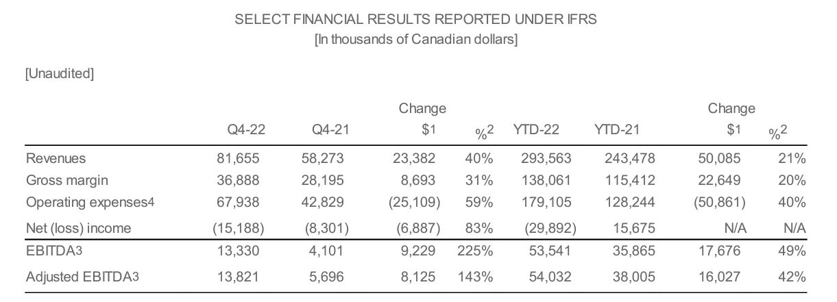 En ellos, reportó que durante su último ejercicio completo sus ingresos crecieron 21% a 293,6 millones de dólares canadienses (u$s 214,1 millones), frente a los c$ 243,5 millones (u$s 177,6 millones) de 2021.
