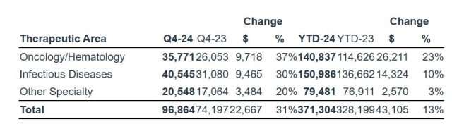 En un desglose por unidades, el área de Oncología/Hematología creció 23% a C$ 148,3 millones (u$s 98,3 millones), mientras que Enfermedades Infecciosas subió 10% a C$ 151,0 millones (u$s 105,4 millones). Por último, Otras Especialidades ascendió 3% a C$ 74,5 millones (u$s 55,5 millones).