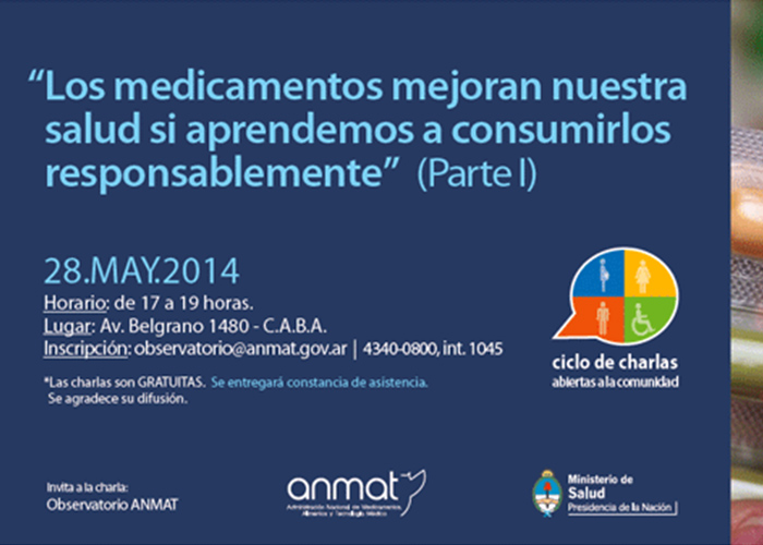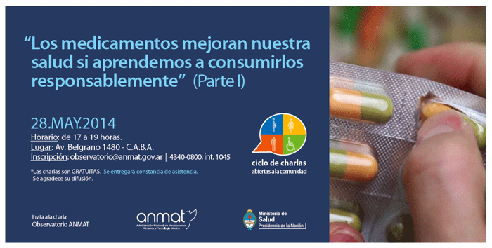 La ANMAT realizará el día miércoles 28 de mayo el cuarto encuentro gratuito «Los medicamentos mejoran nuestra salud si aprendemos a consumirlos responsablemente -Parte I-«, que se llevará a cabo en el salón auditorio de la sede de Tecnología Médica, ubicada en Av. Belgrano 1480 PB, desde las 17 hasta las 19 hs.