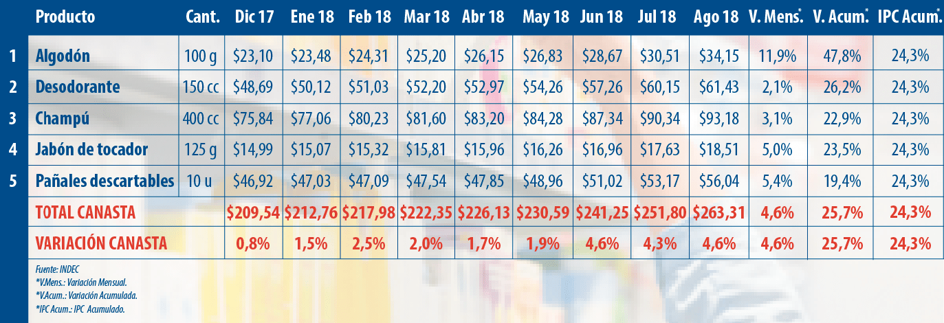 Durante agosto, el INDEC dijo que un paquete de algodón de 100g; un jabón de tocador de 125 gr; un desodorante de 150 cc; un champú de 400 cc; y pañales descartables por 10 unidades costaron $263.31. En julio, el mismo grupo de productos cotizaba a $251.80. Así, la canasta de higiene relevada por el INDEC exhibió una suba del 4.6% al comparar mes contra mes, a la vez que acumula un 25.7% en lo que va del año, quedando por encima del IPC anual.