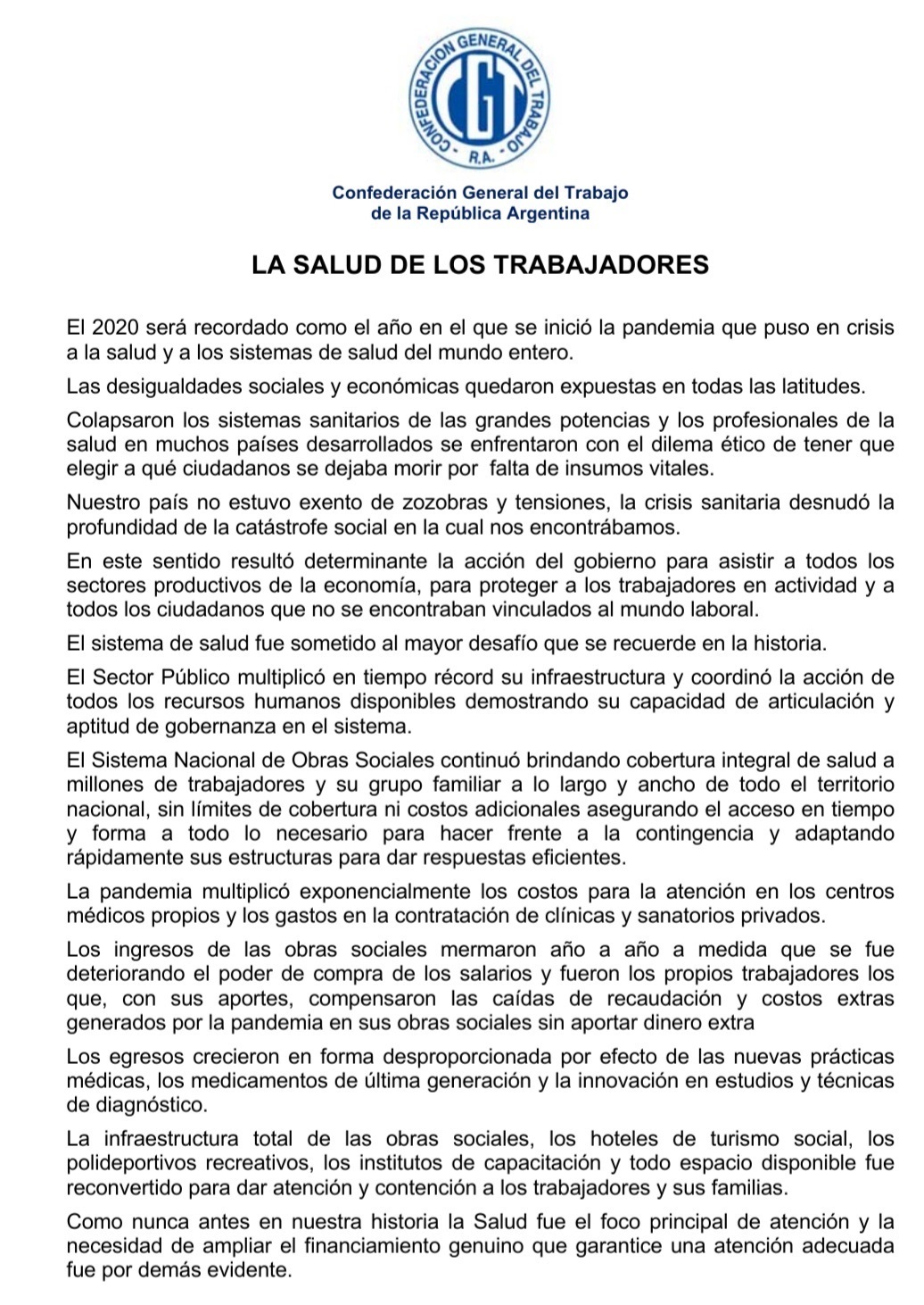 Para la central obrera, nunca antes en nuestra historia la salud fue el foco principal de atención. «La necesidad de ampliar el financiamiento genuino que garantice una atención adecuada fue por demás evidente«, subraya.