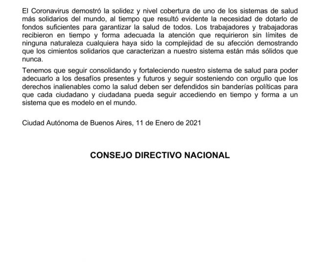 Por otro lado remarca que la pandemia «multiplicó exponencialmente los costos para la atención en los centros médicos propios y los gastos en la contratación de clínicas y sanatorios privados» y que «los ingresos de las obras sociales mermaron año a año a medida que se fue deteriorando el poder de compra de los salarios y fueron los propios trabajadores los que, con sus aportes, compensaron las caídas de recaudación y costos extras generados por la pandemia en sus obras sociales sin aportar dinero extra».