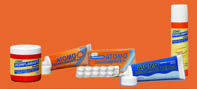 Hoy, en tiempos en que ya se comercializa en todo el Mercosur, existen nuevas variedades de Atomo, como Geldic (con gel), Ibu (con ibuprofeno, en comprimidos), Aerosol y Depor (especial para deportistas). Su fórmula contiene salicilato de amilo, mentol, alcanfor, eucaliptor, terpineol y guayacol.
